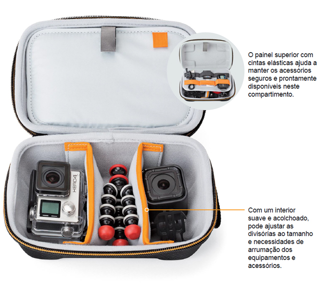 Proteja e organize os seus equipamentos preferidos de vídeo, como a GoPro®HERO4, ou outras câmaras de acçãosimilares, com os estojos leves e resistentes a impactos com tecnologia FormShell™.